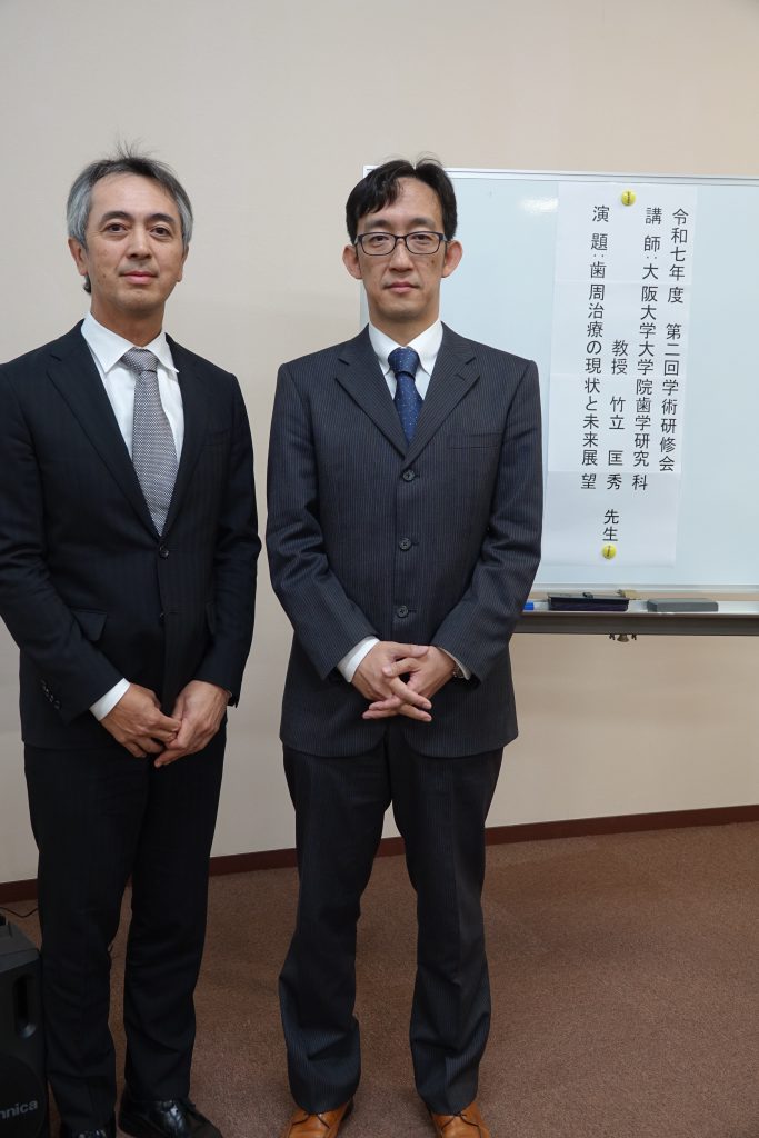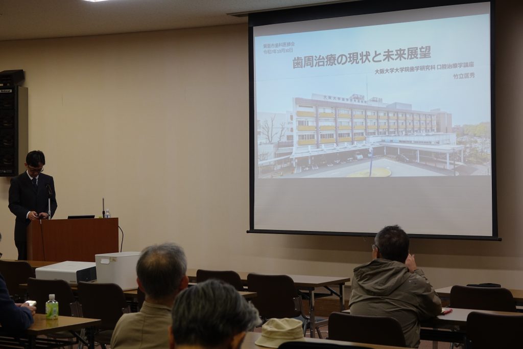 箕面市歯科医師会では、地域の皆さまに質の高い歯科医療を提供できるよう、定期的に学術研修会を行っています。このたび、大阪大学大学院歯学研究科の竹立匡秀教授をお招きして、「歯周治療の現状と未来展望」をテーマに講演していただきました。
